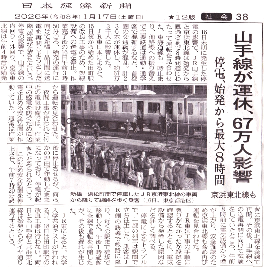 1月16日始発前に架線給電関係改良工事の終了作業をしていて失敗。繋ぎの作業で変電所を壊してしまい、当該の山手線、京浜東北線に加え東海道線も熱海までのJR東区間を運転見合わせして13時近くまで不通となった。詳細原因は調査中で不明だが、作業終了の饋電復活作業の手順を間違えてしまい、あわてて行った仮の措置が不適切で変電所を壊してしまった疑いが濃厚だ。