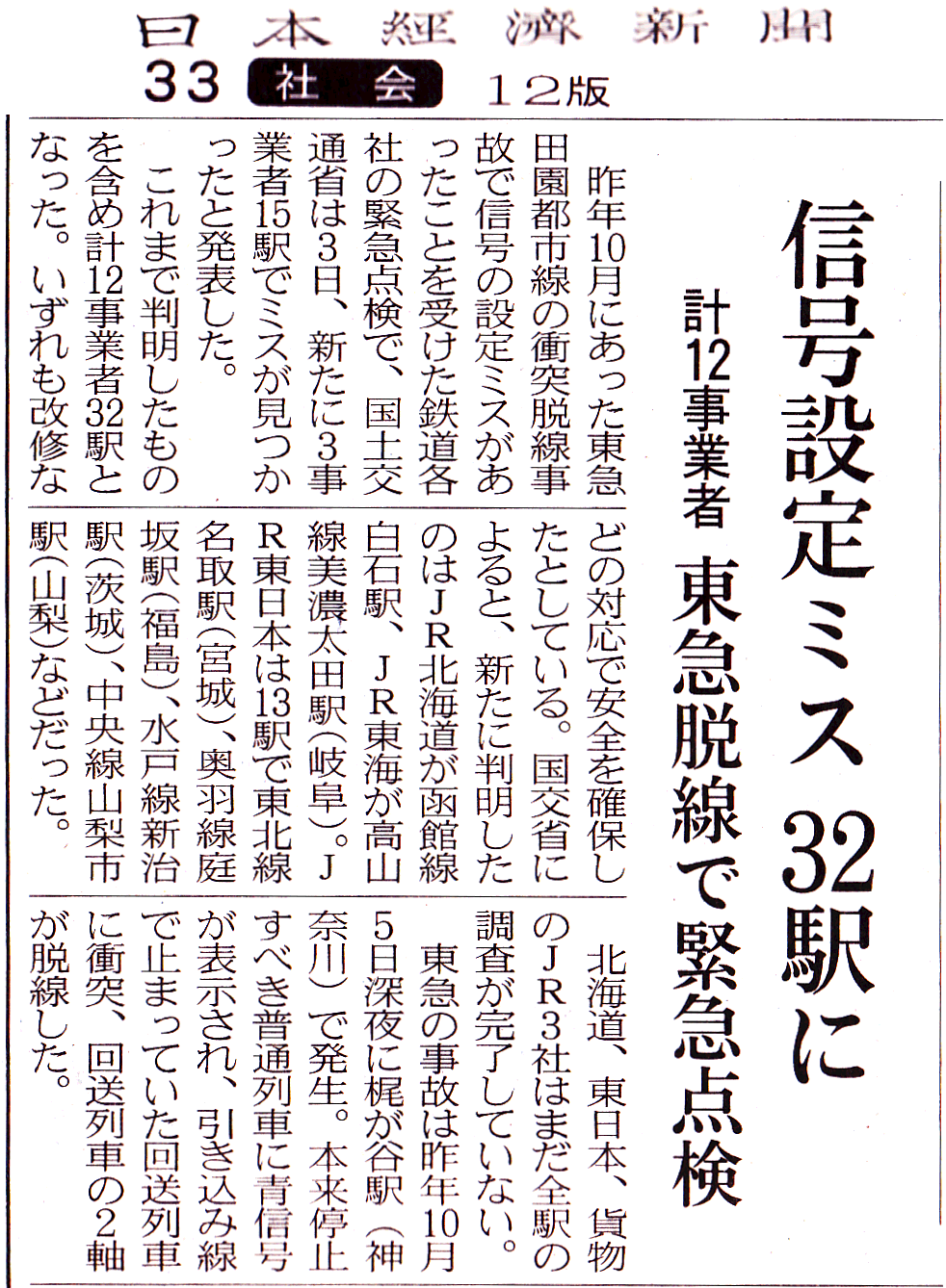 昨年10月に東急田園都市線梶が谷駅で起きた衝突事故の原因エラーが全国32駅にも発見されたニュース(囲み記事→)。 具体的内容は、衝突防止に車両在線の排他制御を行って誤線へのポイント切替を防いで、赤信号現示をしているが、その範囲設定ミスで進路支障の残る線に向けポイント切替を許容して進行信号を出して衝突に至った事故だった。 信号装置の論理構成なのでミスの発見が難しく10年放置で衝突事故に到り、国交省鉄道局は原因判明後、国内全事業者にエラー点検を指示、12事業者32駅で同種のミスを発見。 北海道、東日本、貨物にはまだ未検証駅が残っている。
