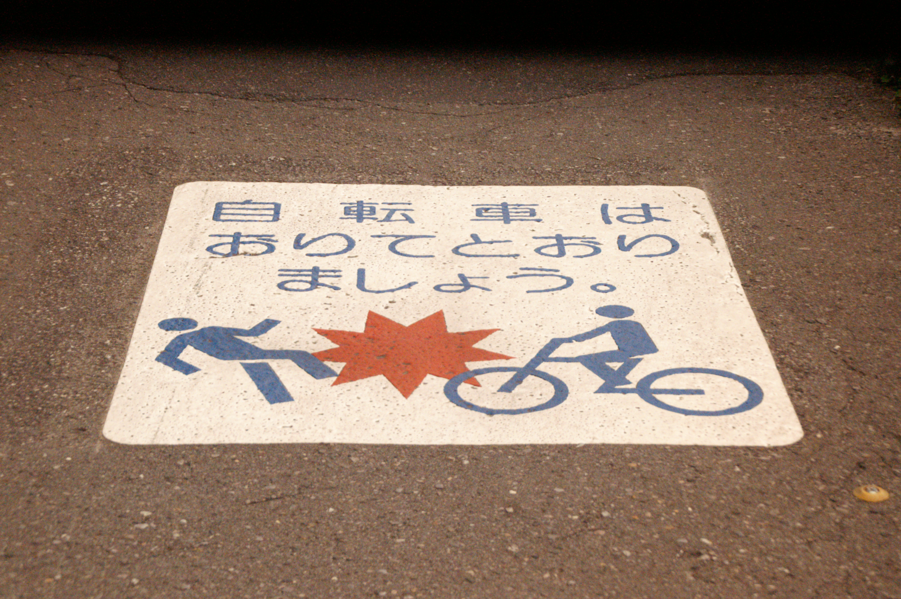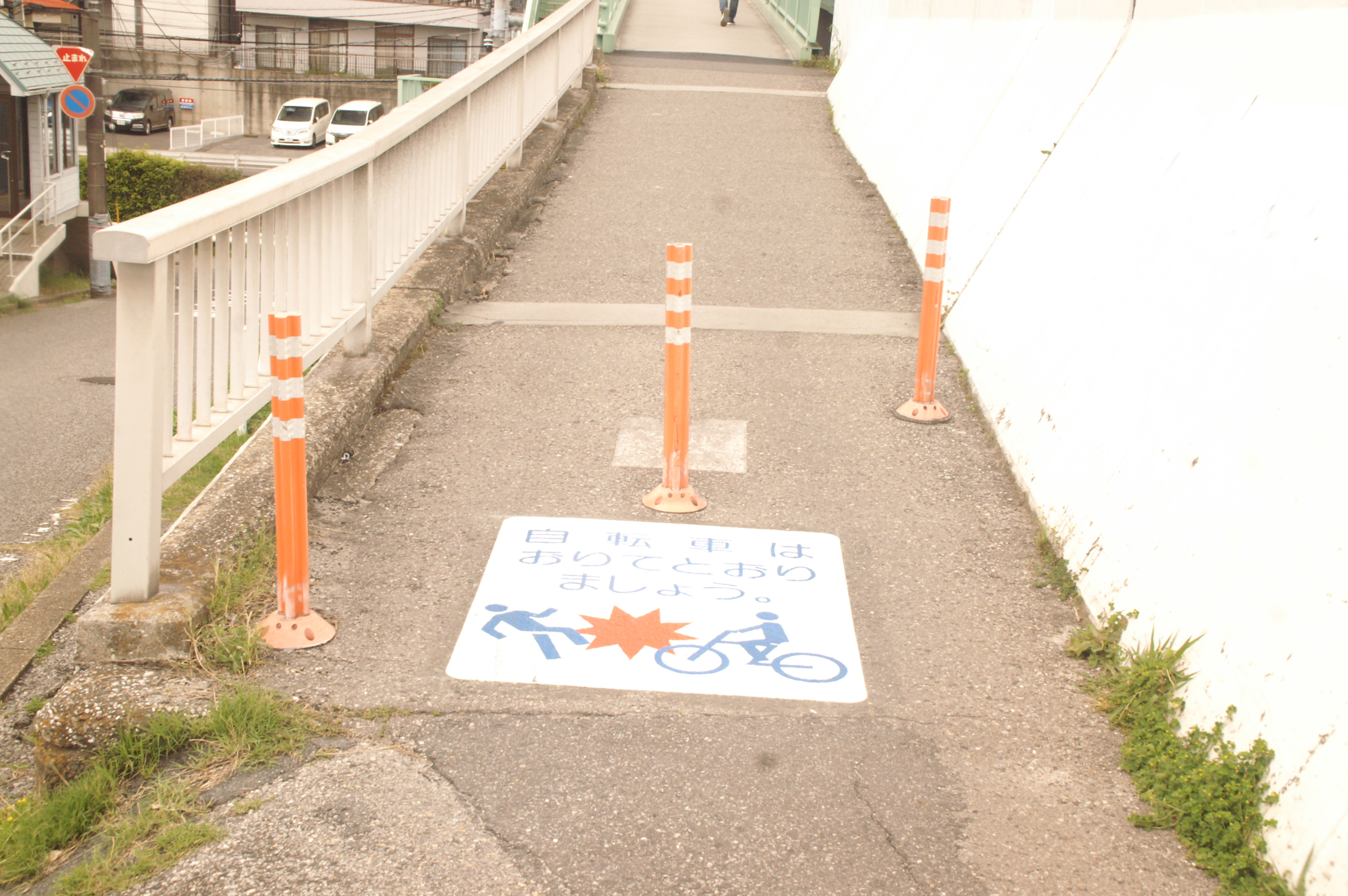 例を挙げれば、道路が200m余の長い陸橋に掛かると片脇に平行して歩道橋が設置されているが、車道橋には「歩行者・自転車通行禁止標識」があり、その脇の歩道橋は従前自転車が両方向で通行していたのだが、その歩道橋の路面に「自転車は押して通行せよ」という表記がされた。
